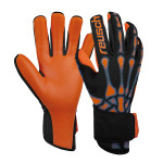 Der Pure Contact Infrared Silver mit seinem speziellen schwarz-orangenem Design ist mit dem Reusch Grip Silver ausgestattet. Dieser, in Deutschland hergestellte, Handflächenschaum hat ein hohes Volumen und sorgt somit für eine verbesserte Griffigkeit und Stoßdämpfung. Zudem garantiert er auch einen weichen Griff. Die FreeFlex Oberhand besteht aus Neopren mit kleinen und dünnen Silikonapplikationen um sie sehr flexibel zu halten.